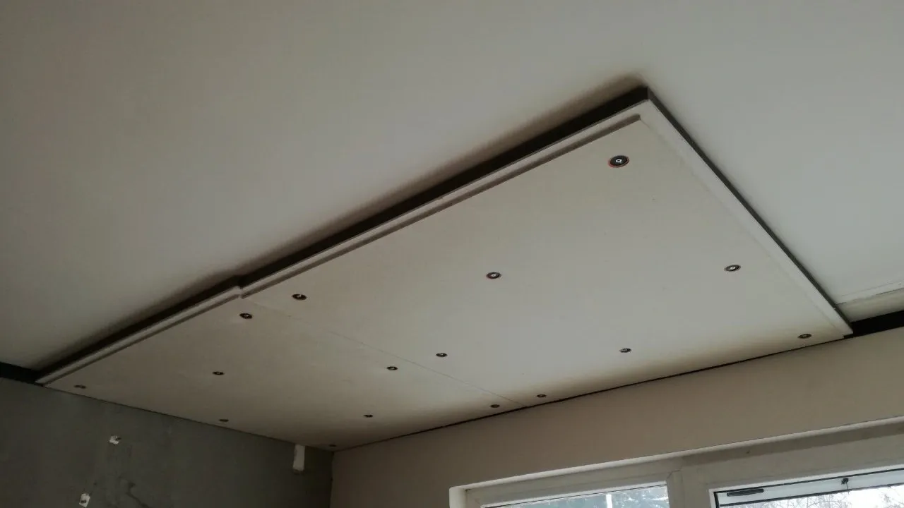 - Tavan subțire, decuplat, pe bare elastice sau cleme. O grilă superficială cu bare elastice creează o interfață flexibilă, astfel încât noua căptușeală să nu fie legată rigid de grinzi sau de placă. Finisați cu două straturi de placă densă și un perimetru etanșat pentru a îmbunătăți performanța la aer, păstrând în același timp spațiul liber.